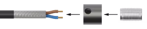 Slide the thickest rubber tube about 7 cm over the cord. It doesn’t matter which side of the cord you choose to start with. Tighten the bolt in the nut and slide it over the cord and the plastic rubber. Make sure it covers the rubber tube completely so you no longer see it. Slide the two thin rubber tubes over the blue and brown colored wires of the cord. If the tubes are longer than the wires, cut the tubes to size with scissors.