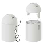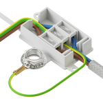 Screw the bolt in the nut and push it from the outside through the hole in the ceiling cap. On the inside of the ceiling cap, place the ground wire (green/yellow) over the bolt first, followed by the ring of the white junction box and end with the locking ring. Tighten the nut until there is no more space between all parts and the ceiling cap.