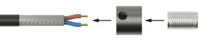 Slide the thickest rubber tube about 7 cm over the cord. It doesn't matter which side of the cord you choose to start with. Tighten the bolt in the nut and slide it over the cord and the plastic rubber. Make sure it covers the rubber tube completely so you no longer see it. Slide the two thin rubber tubes over the blue and brown colored wires of the cord. If the tubes are longer than the wires, cut the tubes to size with scissors.