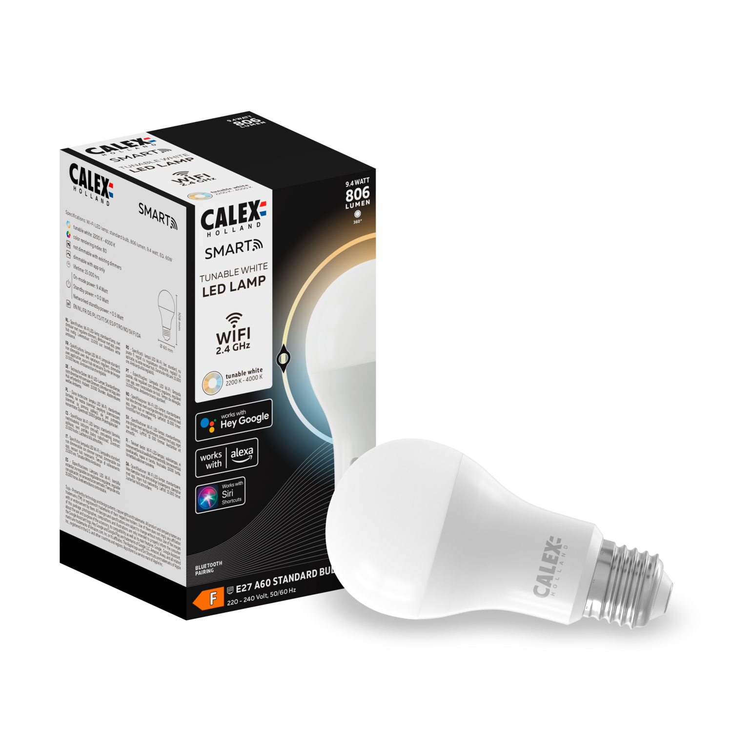 Op zoek naar een Smart lamp die meer gericht licht biedt? Deze standaard Smart lamp met E27 fitting past in bijna alle armaturen en verandert de kleurtemperatuur eenvoudig via spraakbesturing of de gratis Calex app. Ga in een handomdraai van helder ochtend licht naar warm avondlicht voor gezellige avonden. Stel timers en routines in om je wooncomfort te optimaliseren. Let op! Deze smart lampen werken op een normale wandschakelaar en via wifi. Niet op een dimmerschakelaar. Via de Calex smart afstandsbediening en de gratis Calex app kan je deze lampen met wifi verbinden en instellen naar de gewenste sfeer. USP's - Verbinding via wifi - Eenvoudige installatie - Gebruiksklaar in 3 simpele stappen - CCT: 2200-4000K (witkleur) - Dimbaar via app en afstandsbediening