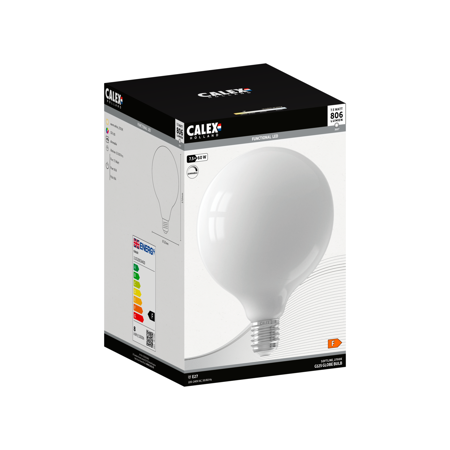 Calex Softline LED Lamp - E27 - G125 - Wit - 7.5W - Dimbaar
