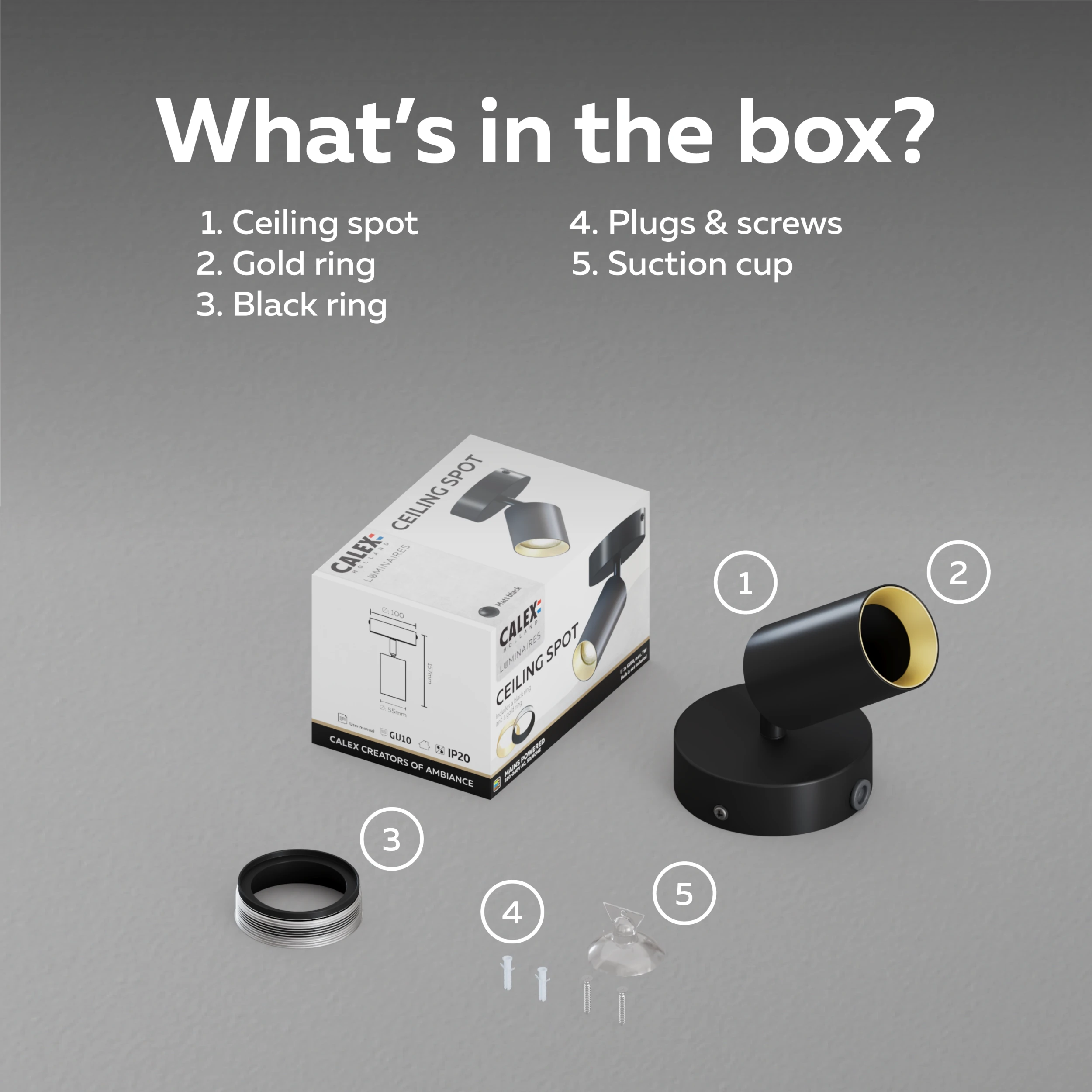 The Calex 1L Spot Round Black-Gold is the ideal choice for anyone looking for a compact yet stylish spotlight. With its matte black finish combined with subtle gold accents, this ceiling-mounted spotlight adds a touch of elegance and warmth to any modern interior. Its round shape and timeless design make it suitable for a wide variety of spaces, from living rooms to hallways.