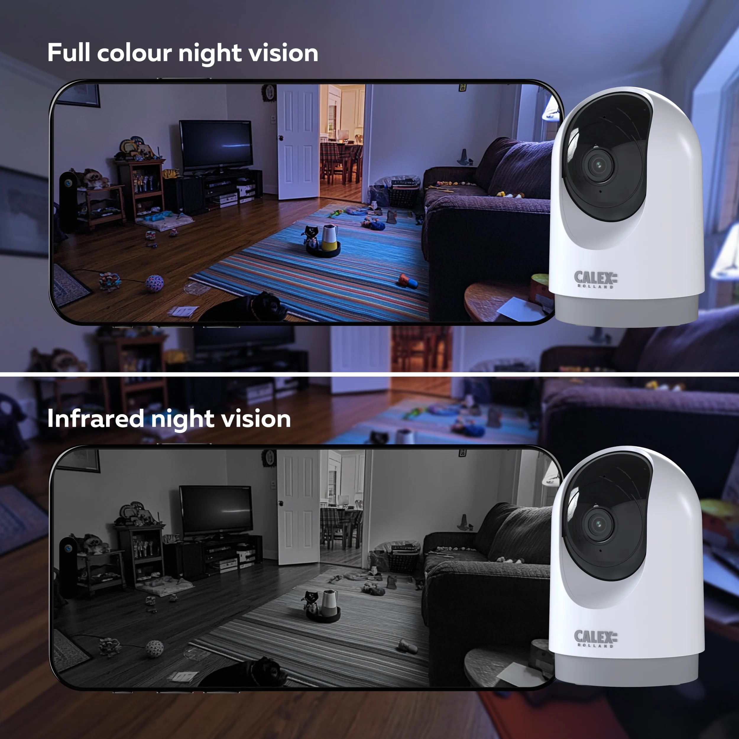 With the Calex Smart App, you can monitor your security camera from anywhere in the world. Manage all your Calex devices, including the camera, for optimal convenience. The app sends notifications to your smartphone when motion is detected. If you're away or haven't checked the app, the footage is automatically saved to the cloud or a micro SD card.