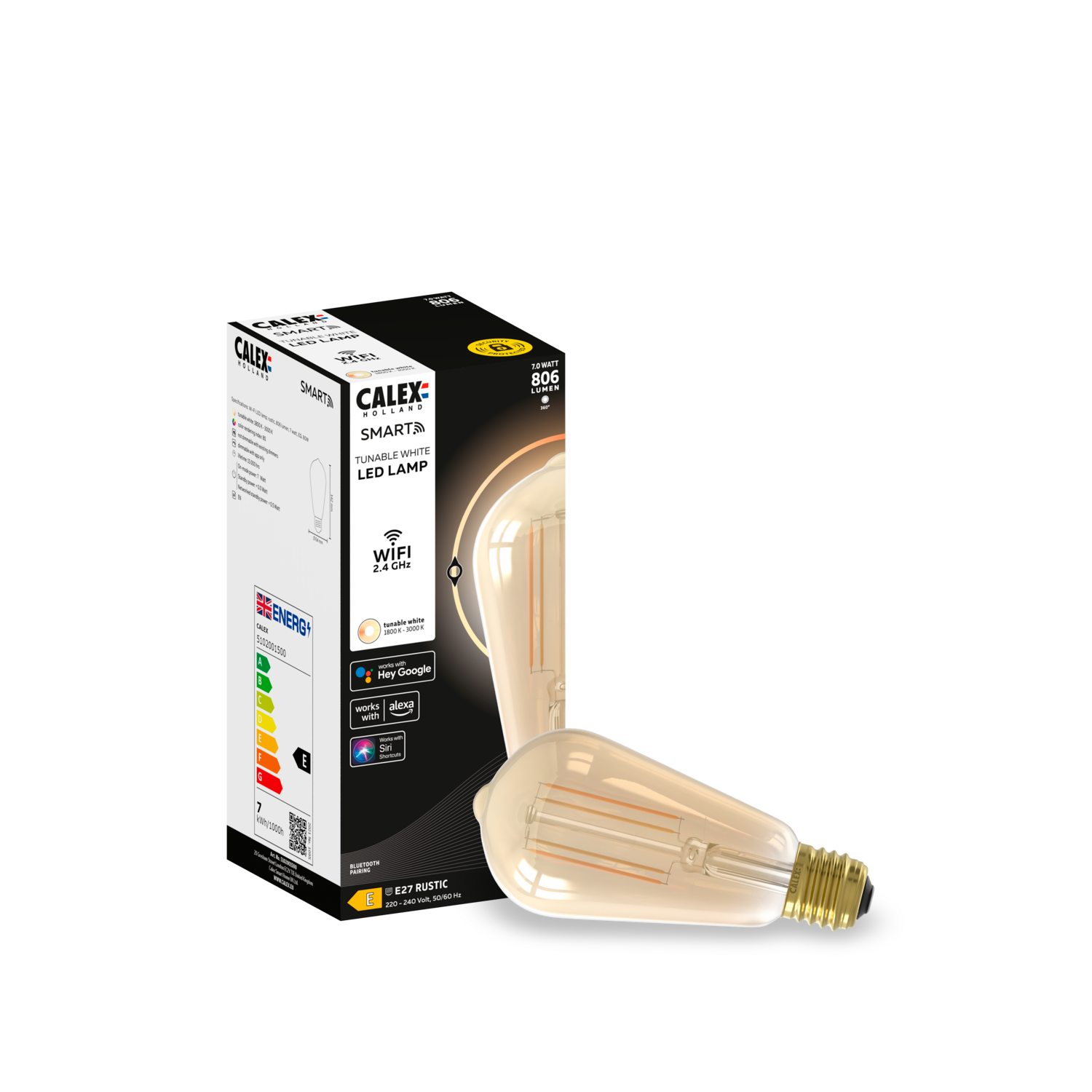 Smart lamps that are made to be seen. The classic gold coating gives this rustic model with E27 fitting a timeless and cozy look. Change the color temperature (1800-3000K) using the app and set timers or routines for all imaginable scenarios. This golden smart lamp with E27 fitting is perfect for hanging above the dining table, a dark corner or bedroom. You can't go wrong with this versatile model! These smart lamps work on a normal wall switch and via WiFi. Not on a dimmer switch. Via the Calex smart remote control and the free Calex app you can connect these lamps to WiFi and set them to the desired ambiance. USPs - Connection via WiFi - Easy installation - Ready to use in 3 simple steps - CCT 1800-3000K (white color) - Dimmable via the app and remote control - Decorative model - Gold coating