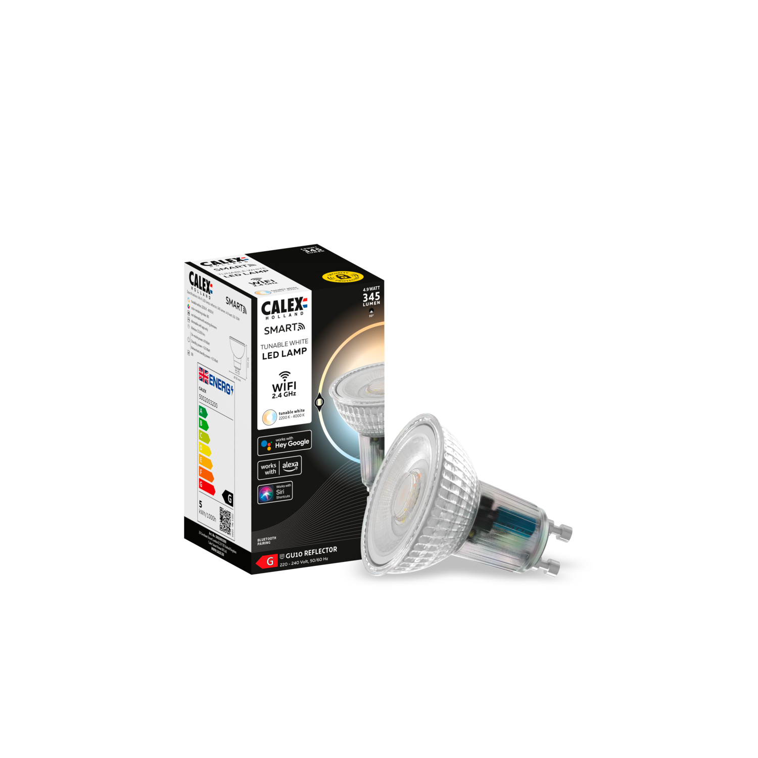 This Smart CCT reflector lamp allows you to easily switch from bright work light to cozy light for the evenings. Use the Calex remote control or the free Calex app for this. These smart lamps work on a normal wall switch and via WiFi. Not on a dimmer switch. With the free Calex app you can connect these lamps with WiFi and set them to the desired ambiance. USPs - Connection via WiFi - Easy installation - Ready to use in 3 simple steps - CCT: 2200-4000K (white color) - Dimmable via app and remote control
